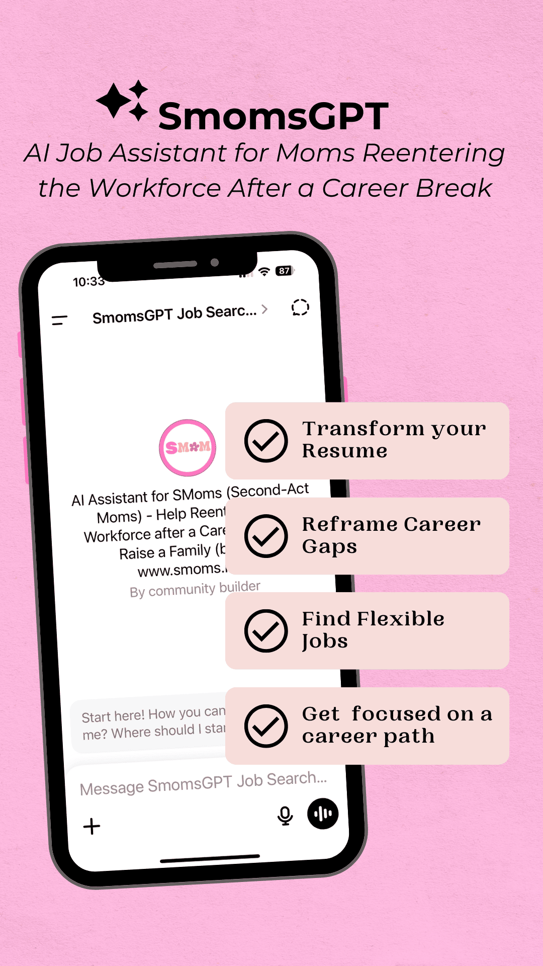 Subscribe below for immediate and free access to SmomsGPT, AI Job Search Assistant for Moms, and join our email list for more tips and tools!